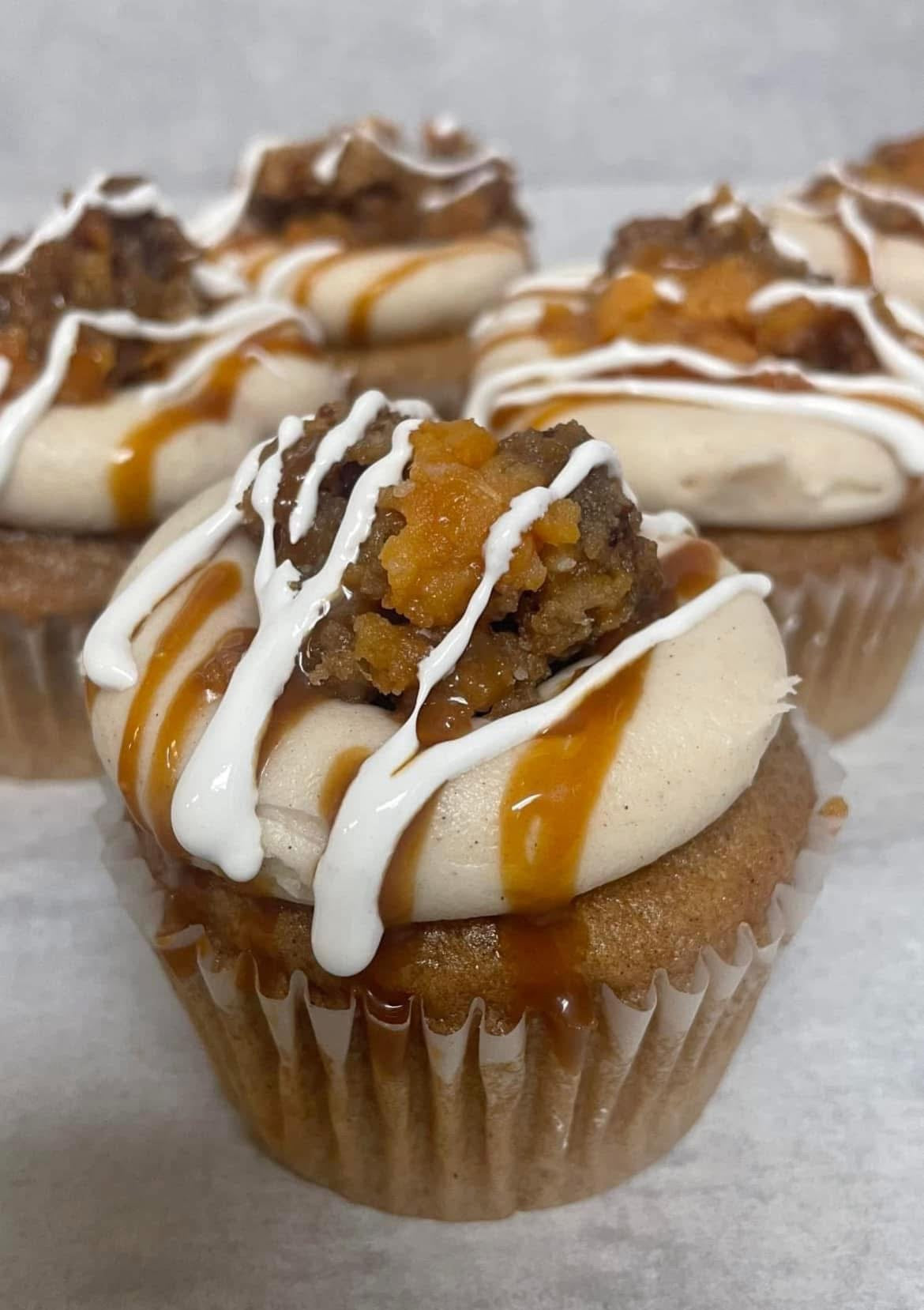 This cinnamon cupcake is topped with cinnamon cream cheese frosting and homemade sweet potato pie, drizzled with caramel and marshmallow cream then topped off with a brown sugar pecan crunch!!